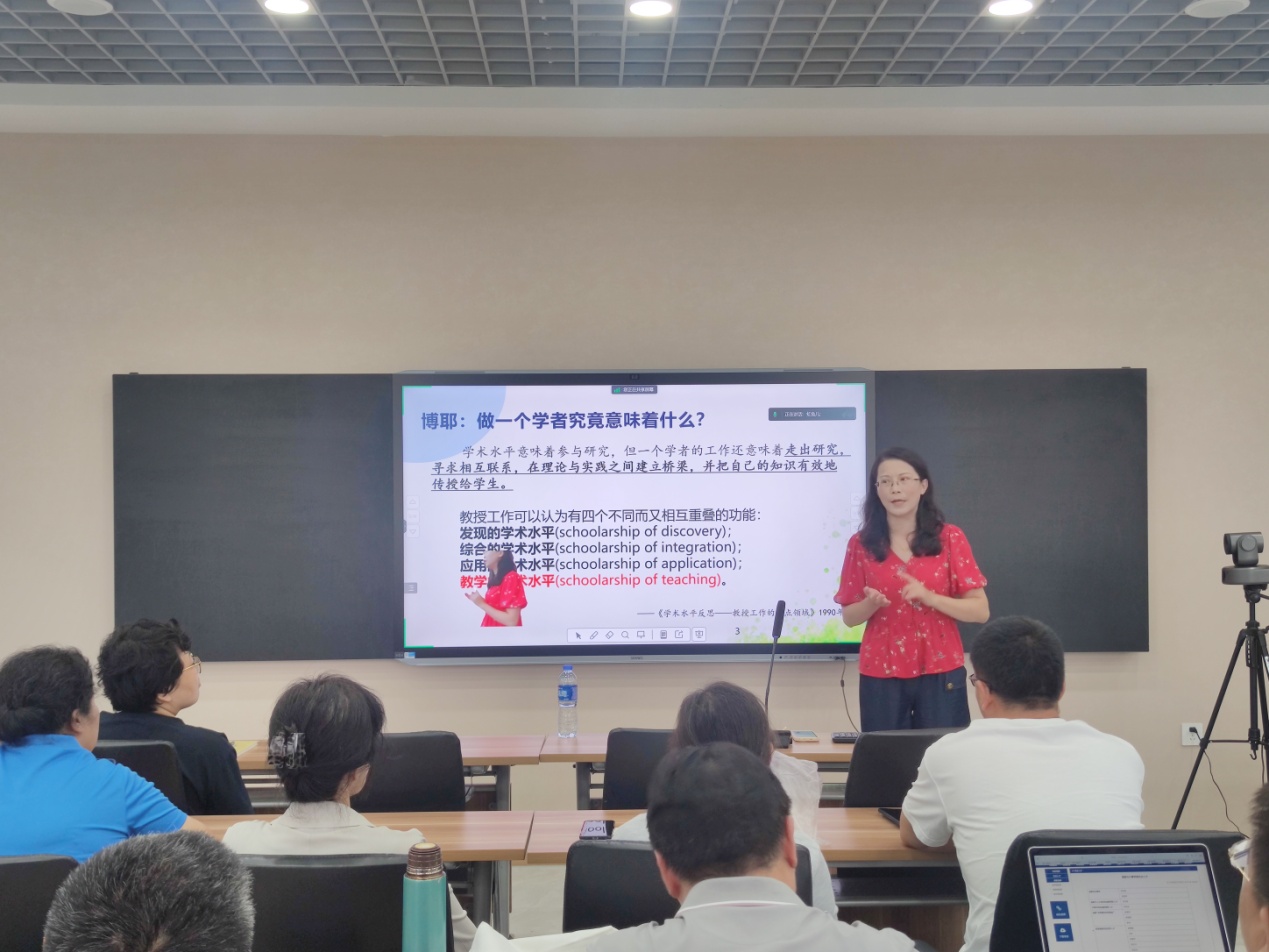 陈娜教授以《“形”“神”兼备:从BOPPPS到P-MASE教学模式漫谈》为题,指出教学与科研并非二元对立,由BOPPPS教学模式解决“形”的问题,由P-MASE教学模式解决“神”的缺位,将“传播”与“接收”最大程度地予以匹配。她强调要将教学规律与教研规律有机融合,实现育人追求的超越与回归,并主张将科研精神融入教育理念,将科研方法转化成教学手段,把科研平台拓展为教学条件,科研反哺、丰富教学内容,把科研设计导入教学实验。