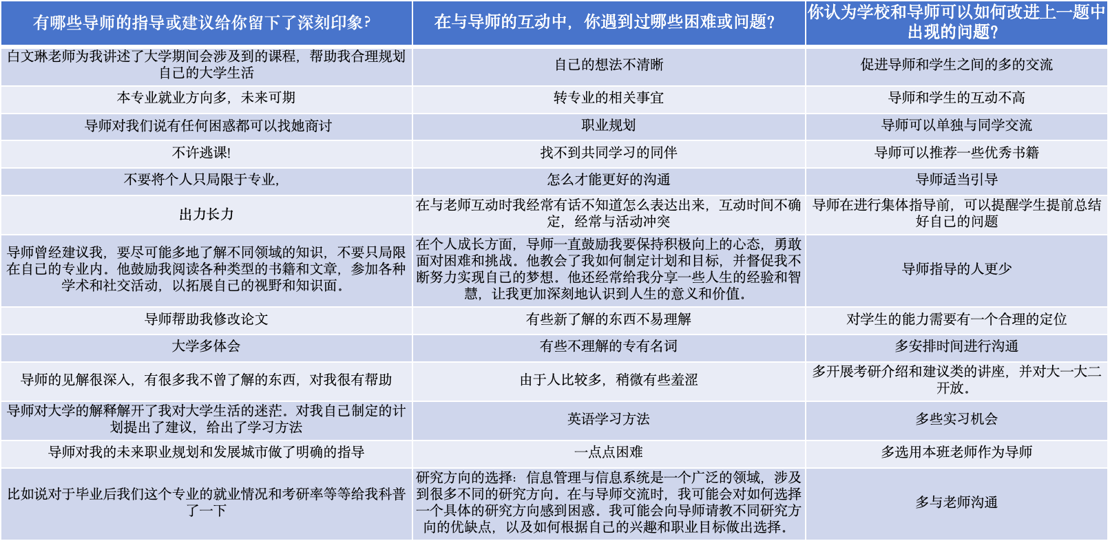 为了走出师生关系中结构性因素对沟通的消极影响这一困境,闫老师倡导并实施了mentor制度。在这个制度下,高年级学生作为mentor,与新生建立一对一的指导关系。这些mentor不仅是知识的传播者,更是经验的分享者。高年级学生用自己的学术经历和生活智慧,帮助新生快速适应大学生活。同时,这一制度也使新生能够更有效地利用校园资源,如图书馆、实验室和学术讲座等,从而更顺利地开始他们的学术旅程,激发他们对数据科学的兴趣和热情。此外,mentor制度还为高年级学生提供了一个宝贵的机会,让他们在实践中培养领导力和责任感。通过担任mentor的角色,高年级学生能够锻炼他们的沟通能力、团队协作能力以及解决问题的能力。这种经历对于他们未来的职业发展和个人成长都产生了积极作用。