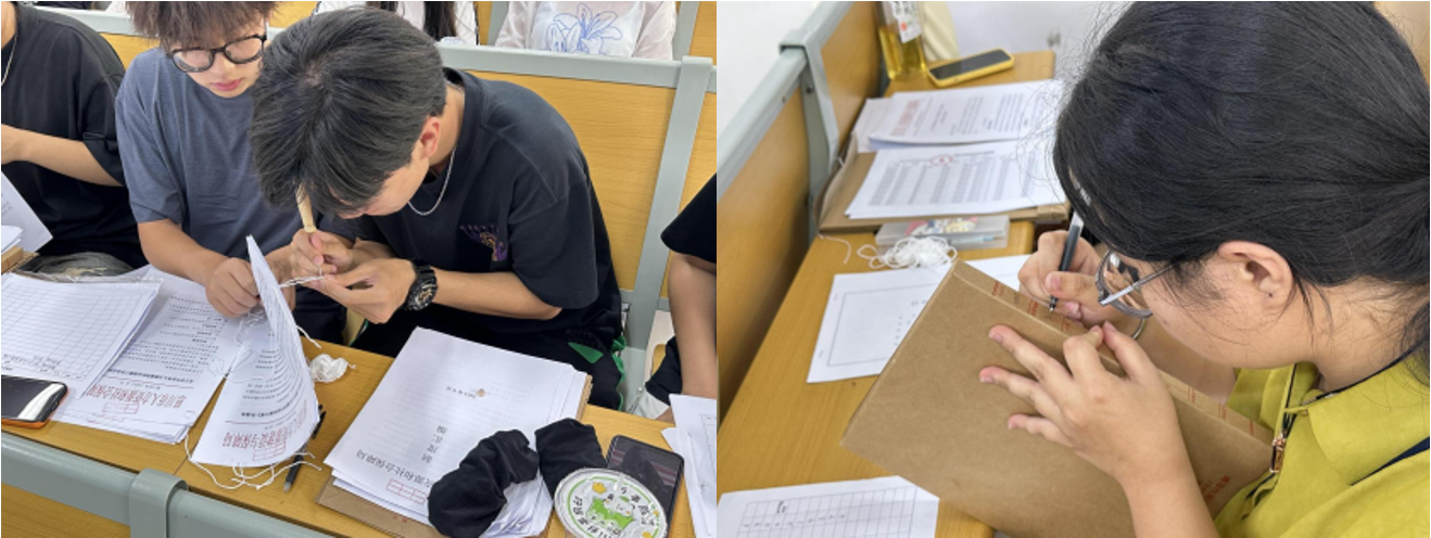 左图:学生在实操“三孔一线” 右图:学生在填写卷脊内容