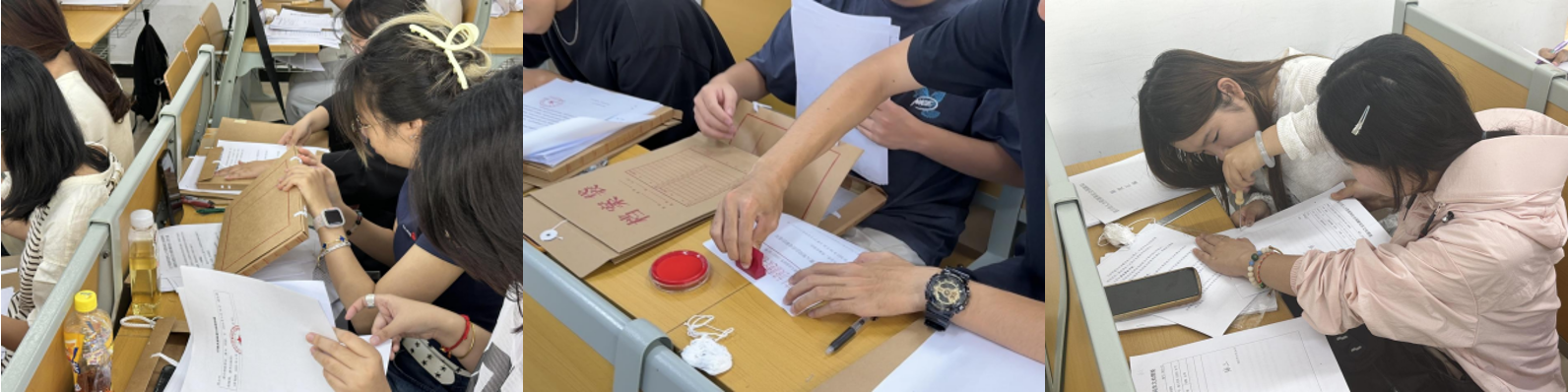 左上图:学生在梳理文件材料 中上图:学生在加盖归档章 右上图:学生在打孔