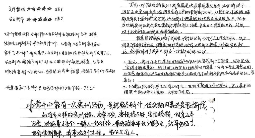 《文书学》课程此次实训环节的成功开展是档案系深化教学改革、提升人才培养质量的重要尝试,打破了传统课堂"教师讲授-学生听讲"的单向模式,通过增加课程中实践教学的内容,培养兼具扎实理论功底与熟练实操能力的复合型档案人才。