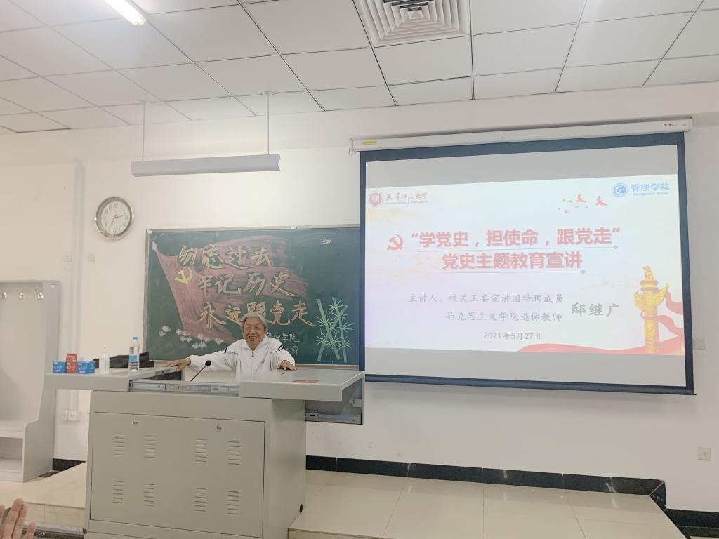 为深入开展党史学习教育,引导我院师生学习百年党史,汲取奋进力量,续写崭新篇章。5月28日下午,伟德国际victor·1946源自邀请校关工委宣讲团特聘成员、马克思主义学院退休教师邸继广老先生做“学党史,担使命,跟党走”党史主题教育宣讲。伟德国际victor1946党委离退休工作部全体成员,伟德国际victor·1946源自150余名党员、团员代表聆听讲座。伟德国际victor1946离退休处处长苏秀娟,马克思主义学院党委书记李靖在讲座开始前同邸老进行了深入交流。